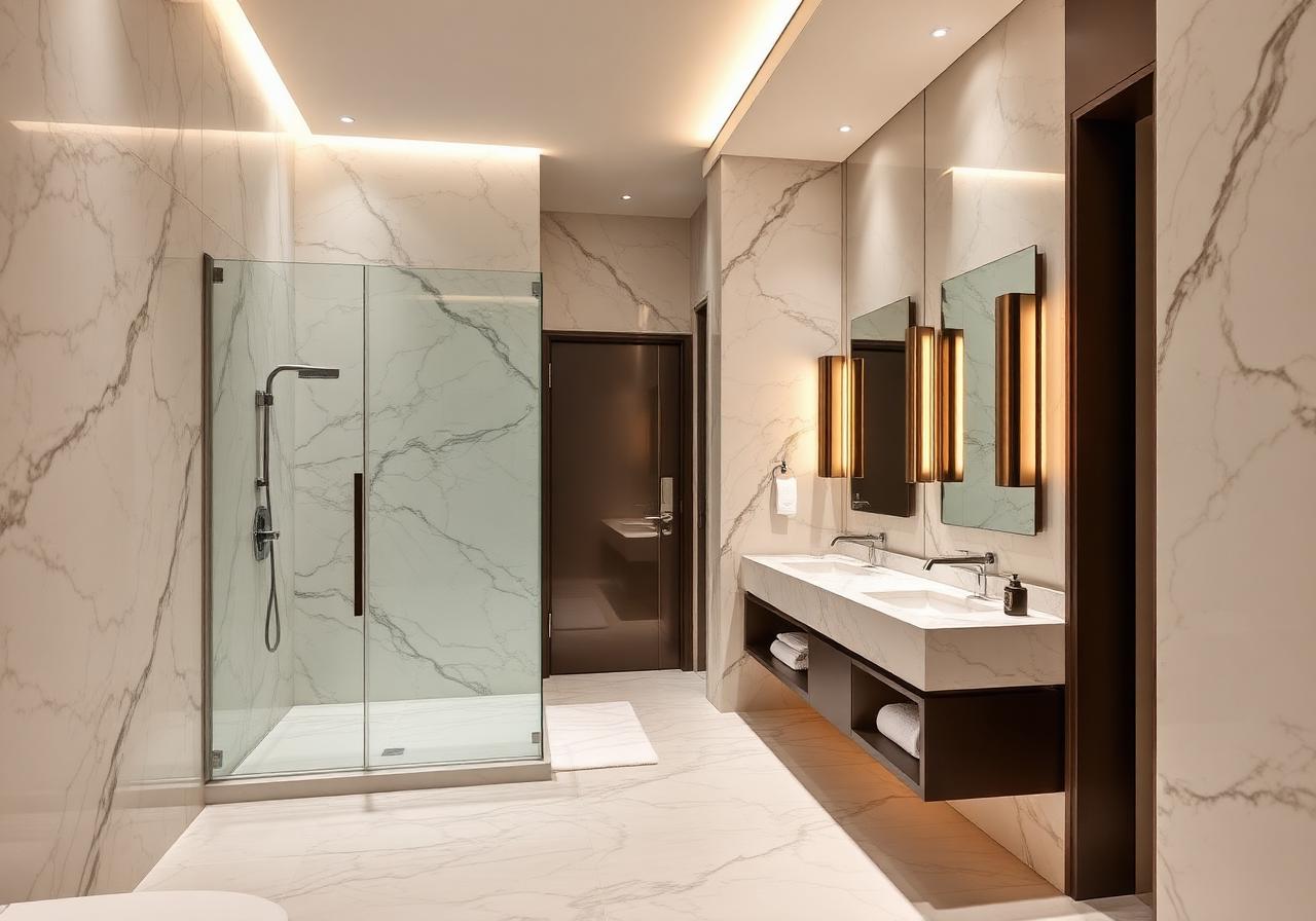 Rénovation complète d'une salle de bain avec carrelage grand format, vasques noires sur meuble bois et miroir rétroéclairé.