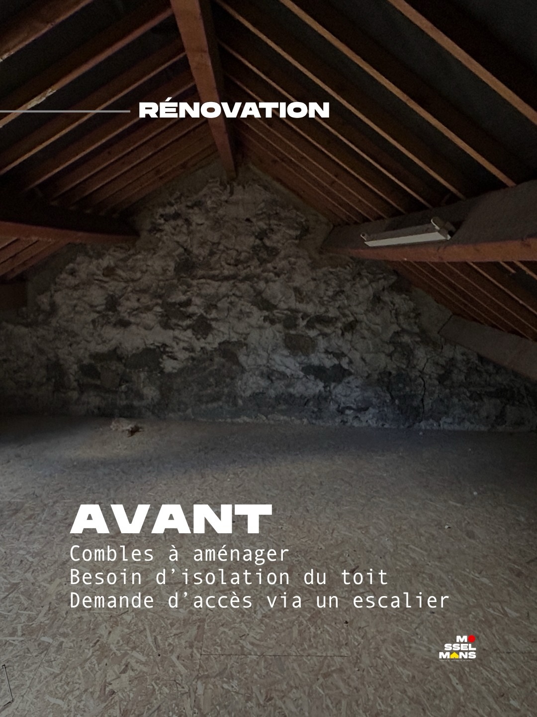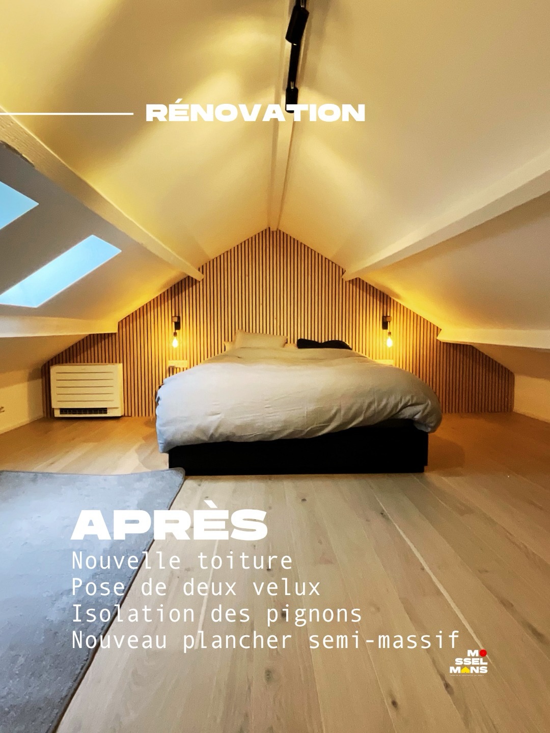 Combles bruts transformés en chambre cosy : nouvelle toiture, pose de deux velux, isolation des pignons et plancher semi-massif.