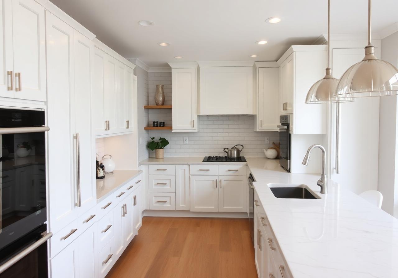 Réaménagement complet d'une cuisine avec création d'un îlot central, nouveau carrelage et plan de travail sur mesure.